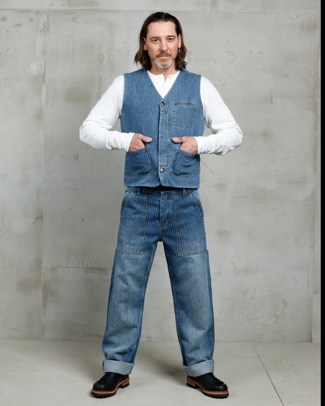 De duurzame Wabash denimstof benadrukt de werkkledingtraditie.