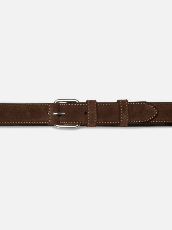 Deze bruine suède riem is gevoerd met volnerfleer en heeft contrasterende stiksels. Twee lussen houden het uiteinde van de riem netjes op zijn plaats, en waar de gesp de pin raakt, is de gesp met leer omwikkeld, simpelweg omdat het er mooi uitziet. Antieke zilverkleurige metalen riemgesp en een reliëf Nudie Jeans-logo.