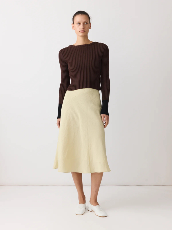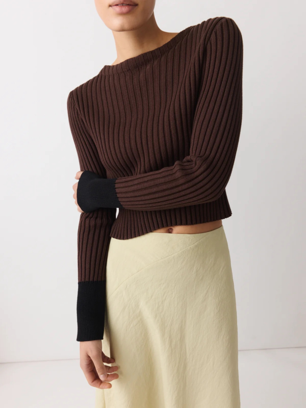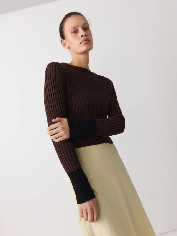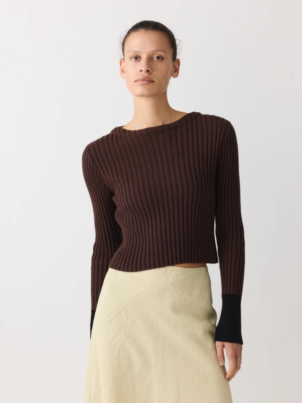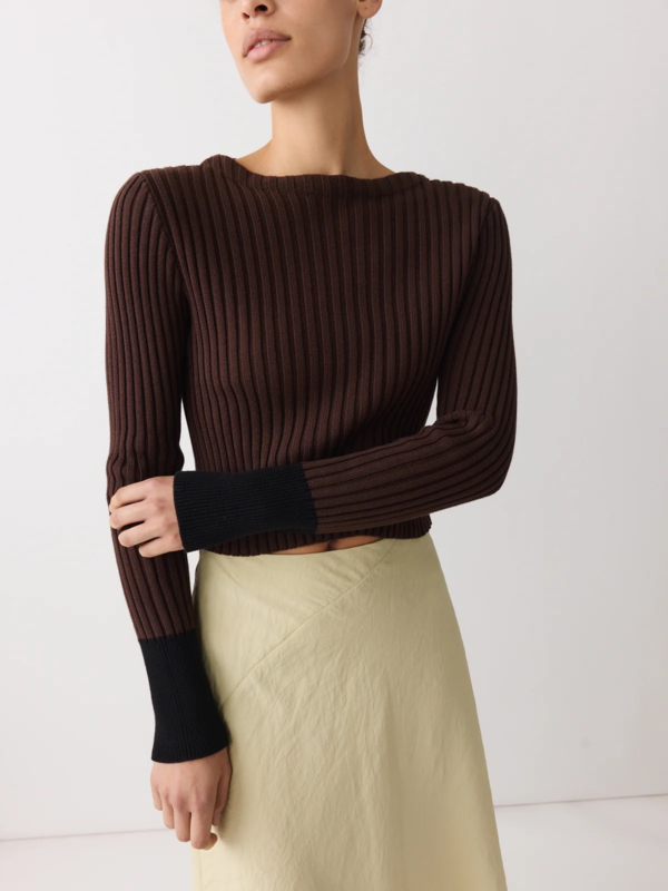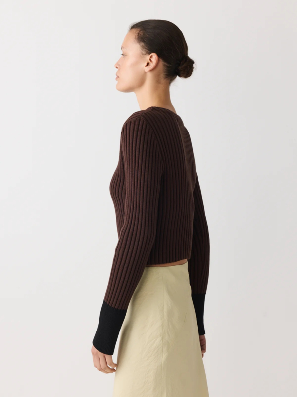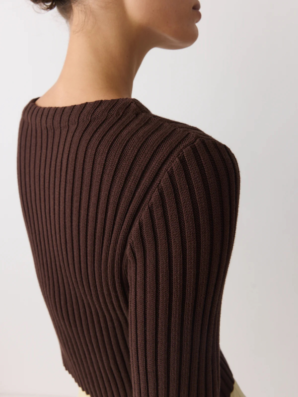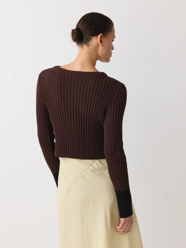 Zomertrui, uitgevoerd in een rijke, krachtige neutrale tint diep koffiebruin, kenmerkt zich door een kort dicht ribgebreid lijfje en een getailleerde pasvorm. De trui is gebreid van zwaar katoen en heeft een omgeslagen boothals, nette schouders en contrasterende ribgebreide mouwen met bij het manchetgedeelte contrasterend marine, tegen het zwart aan boord.