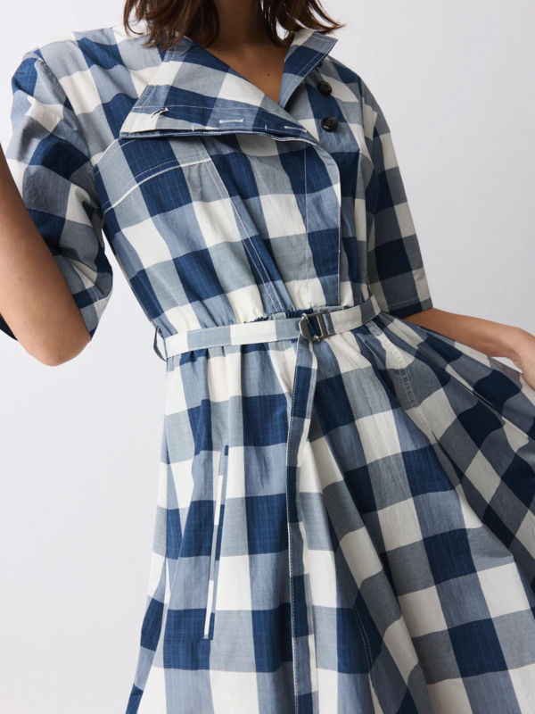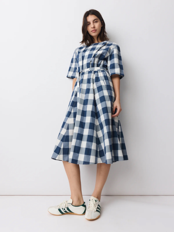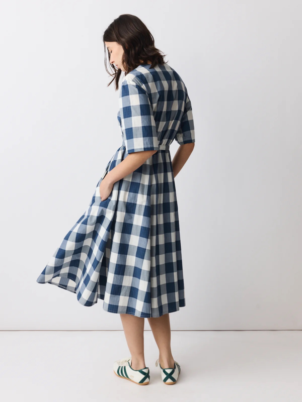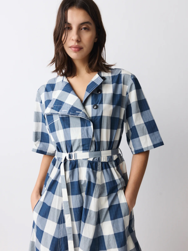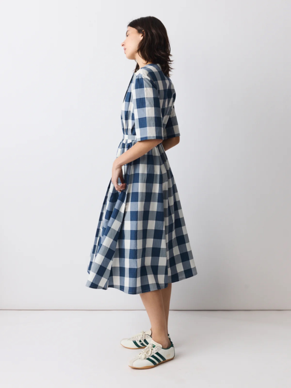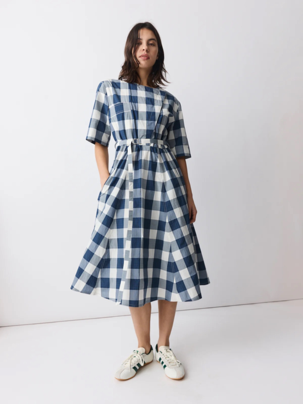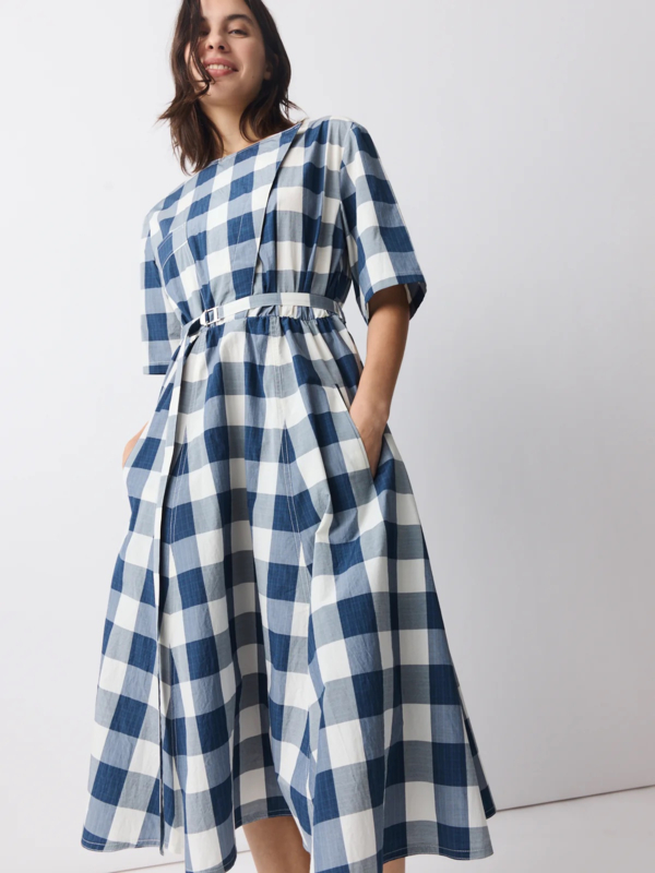 Vrouwelijke midi-jurk in ecru met een verfijnd blauw ruitpatroon, gemaakt van een katoen-polyester mix met een subtiele Japanse touch. De jurk heeft een ronde halslijn, een diagonale split aan de voorkant en een bijpassende centuur om de taille te accentueren.