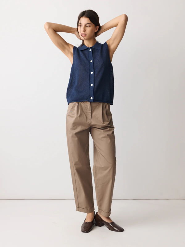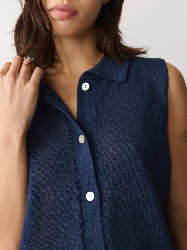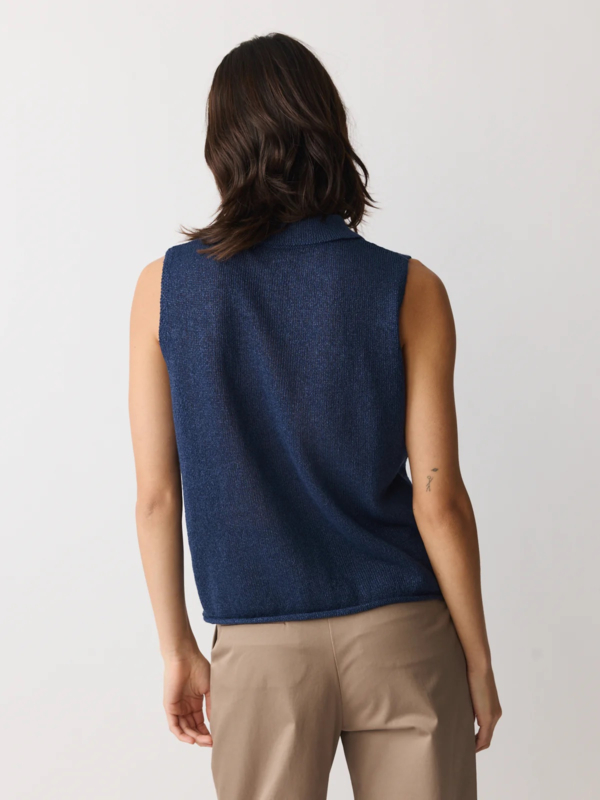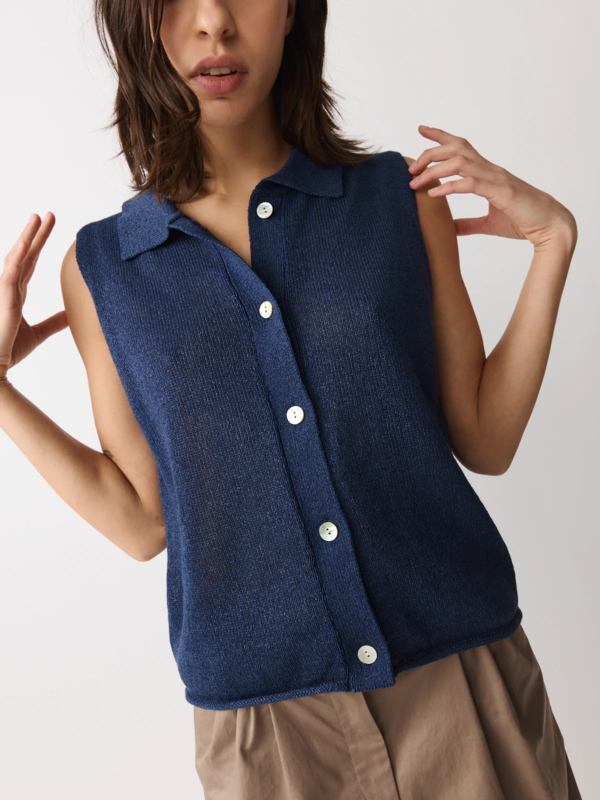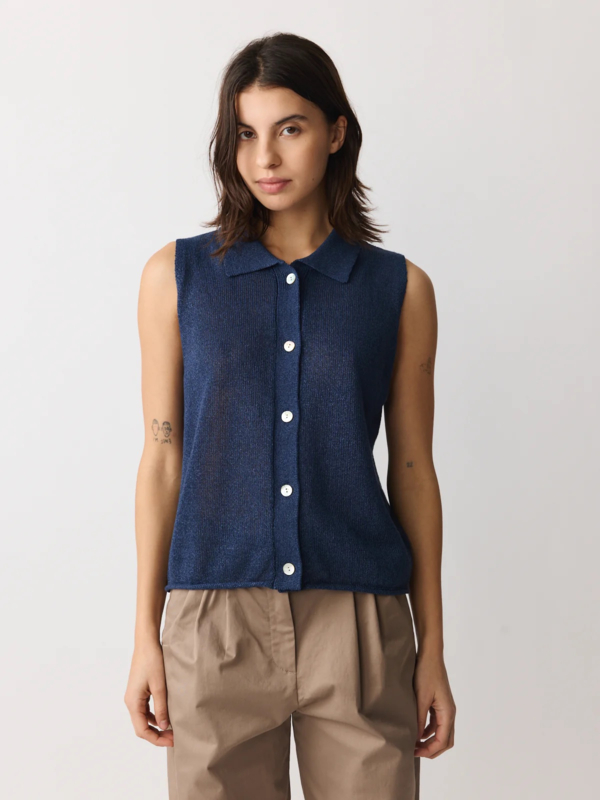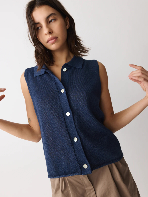 Gebreide top/polo valt op door het garen, gemaakt van een frisse mix van papier en gerecycled polyester in een marineblauw. De top heeft een polokraagje, geen mouwen, een normale pasvorm. Knoopjes voor.