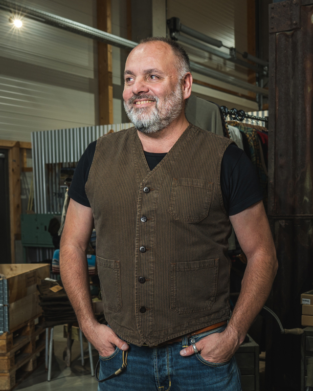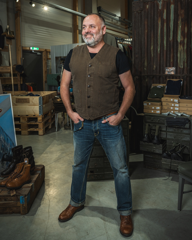 Roamer Vest uit 1937, gemaakt van een mooie denimstof met hickory-strepen. De 13oz selvedge denim met hickory-strepen is voorgewassen, waardoor hij zacht en comfortabel is om te dragen.
